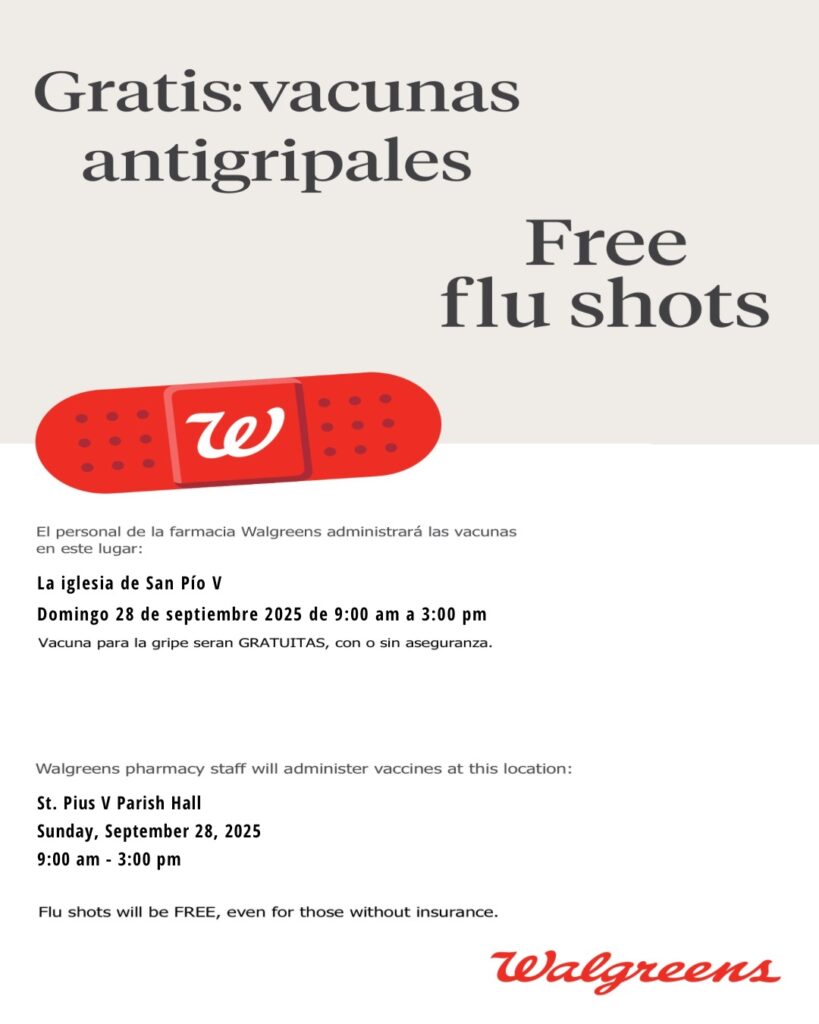 St. Pius V Parish and Walgreens want everyone to have access to flu shots this year. Walgreens pharmacy staff will be here in the parish hall to administer the vaccines. They are free and insurance is not required.