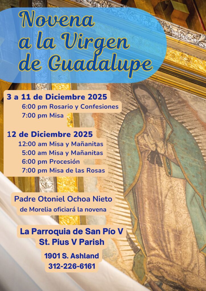 A partir del miércoles 3 de diciembre, nos reuniremos cada día a las 6:00 pm en la iglesia de San Pío V (1901 S. Ashland) para honrar a Nuestra Señora de Guadalupe. La novena culminará en el día de su fiesta, el 12 de diciembre.